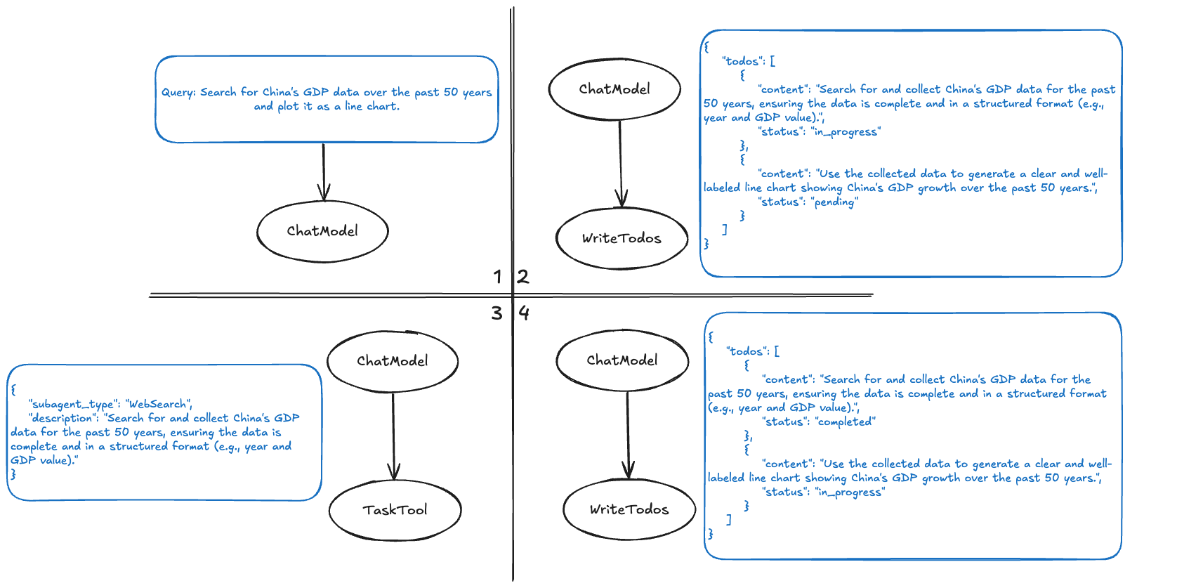 💡 For simple tasks, calling WriteTodos every time may have a negative effect. The WriteTodos Description includes some common positive and negative examples to avoid not calling or over-calling WriteTodos. When using DeepAgents, you can add more prompts according to actual business scenarios to make WriteTodos called at appropriate times.